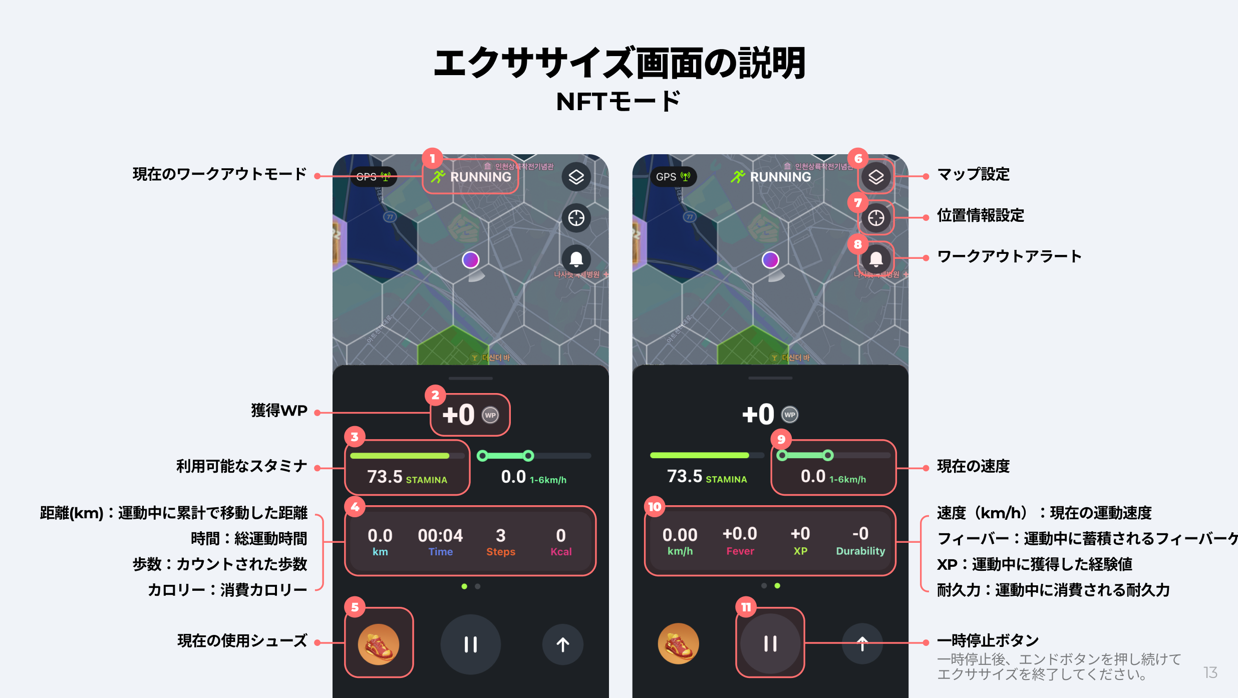 ユーザーは運動中にスタミナを消費するため、ワークアウトシューズの耐久力は減少します。耐久力が90未満になると、獲得できるワークアウトポイントの量が減少します。シューズの耐久力は運動の開始時に決定され、運動中の耐久力の減少は獲得したワークアウトポイントに影響しません。&#x20;